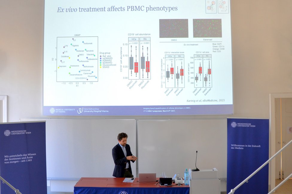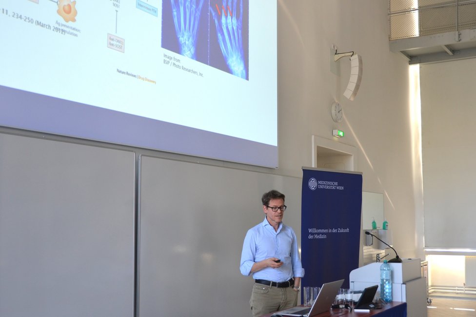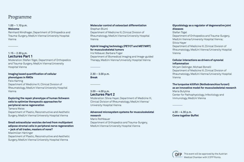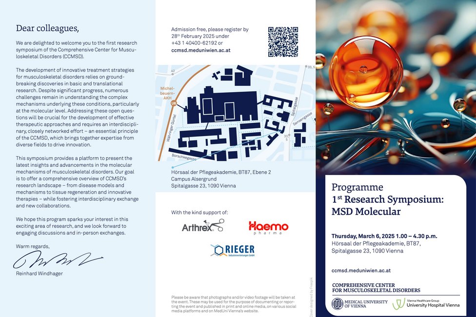 Unter der Moderation von Assoc. Prof. Priv.-Doz. Mag. Dr. Stefan Tögel (Univ. Klinik für Orthopädie und Unfallchirurgie) und Ap. Prof. Priv.-Doz. Dr. Silvia Hayer (Klinische Abteilung für Rheumatologie) wurden interessante, innovative und spannende Themen rund um das Thema "MSD-Molecular" präsentiert. Dazu präsentieren wir Ihnen hier das Programm sowie ein paar Bilder von der Veranstaltung und danken allen Mitwirkenden und Teilnehmenden für ihren Beitrag.